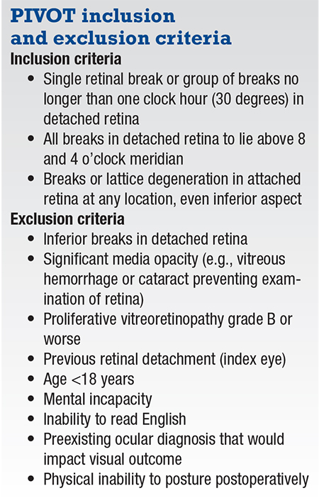 With this in mind, we designed the PIVOT study, a randomized controlled trial that compared pneumatic retinopexy to pars plana vitrectomy, specifically for patients with retinal detachments with one or more breaks in detached retina within one clock hour, in the superior eight clock hours.1 These inclusion criteria were intended to replicate the inclusion criteria of the Pneumatic Retinopexy Trial performed almost 30 years ago that demonstrated favorable visual acuity results for pneumatic retinopexy compared to scleral buckle.2