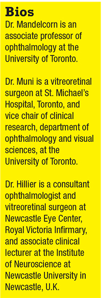 4. Hillier R, Felfeli T, Juncal V, Lampert Monte Francisconi C, Mak M, Muni R. Metamorphopsia and OCT changes following retinal detachment repair: Pneumatic retinopexy versus vitrectomy (“PIVOT” 1-year data). Paper Presented at EURETINA: Vienna, Austria; September 21, 2018.
