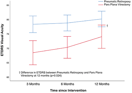PIVOT demonstrated superior visual acuity results for pneumatic retinopexy compared to pars plana vitrectomy at every time point, and by 4.9 Early Treatment Diabetic Retinopathy Study letters at one year (p=0.024, Figure). The proportion of patients who had better than 70 ETDRS letters (20/40) visual acuity was 90.3 percent in the pneumatic retinopexy group vs. 75.3 percent in the vitrectomy group.