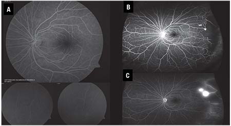 | Figure 1. Regular fluorescein angiography (FA) (A) did not show the peripheral nonperfusion and neovascularization highlighted on widefield FA (B, C). |