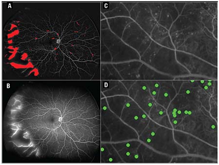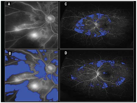 Objective and quantitative measurement tools for angiographic features have been lacking. Current analysis is limited to the clinician’s subjective interpretation. Various investigators have described potential approaches to quantitative assessment of angiographic and widefield angiographic features. Colin Tan, MD, and colleagues in Singapore used stereographic projection software to correct for peripheral distortion and calculate areas of ischemia in anatomically correct physical units (mm2).20 Hossein Rabbani, MD, and