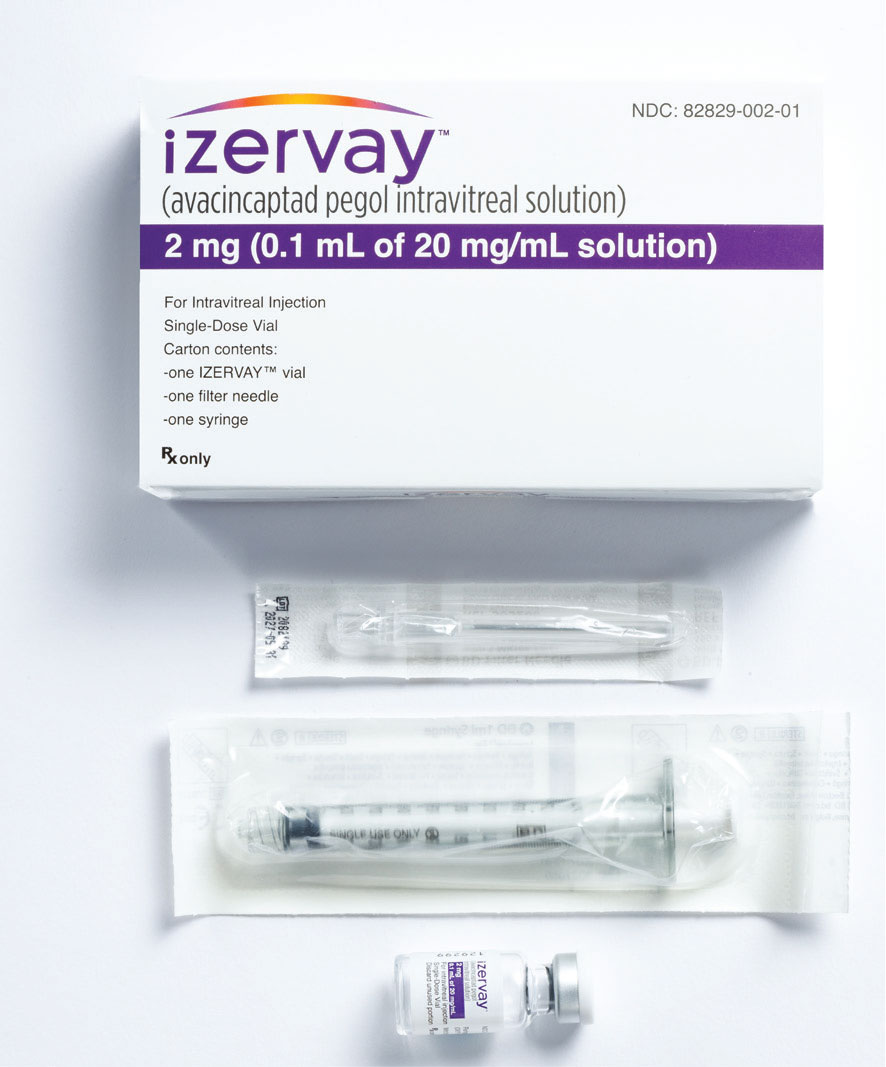 Avacincaptad pegol is 0.1-mL injection of a 20-mg/mL solution for a total of 2 mg of drug per injection. The medication vial is packaged with a 19G filter needle and sterile 1-cc Luer-lock syringe. The injection can be performed with a 30G needle (Figure 2, page 20).14