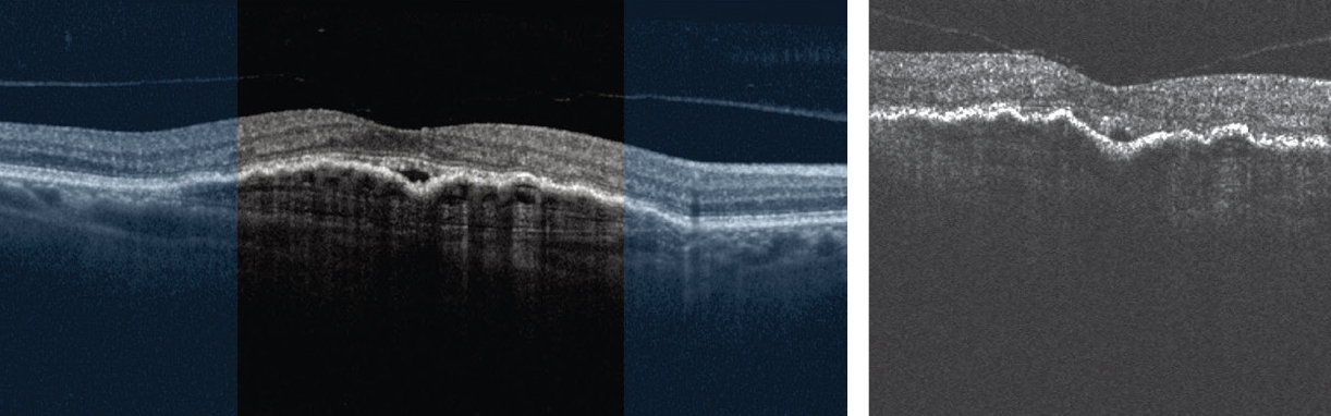 | Image quality comparison of in-office Heidelberg Engineering Spectralis optical coherence tomography scan (left) and patient-operated unsupervised, at-home self-imaging with Notal Home OCT (right and below). |