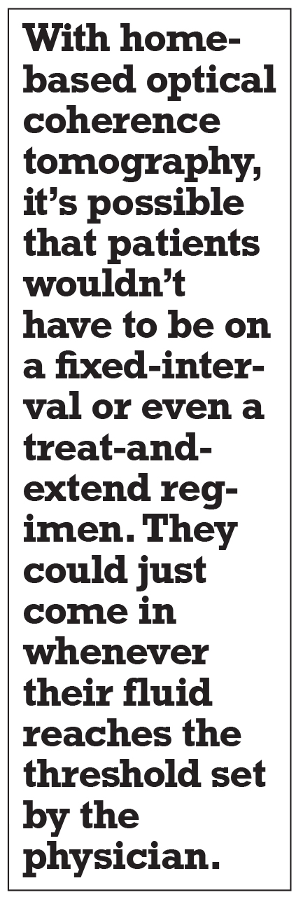 The physician can go to the cloud and look at the image and also set thresholds for retinal fluid. If the patient’s OCT exceeds those thresholds, an alert can notify the physician that the patient needs a treatment, and the patient just comes in for a shot. It’s possible that the patient wouldn’t even need an OCT in the office that day because an OCT was obtained at home, and the physician has access to it.