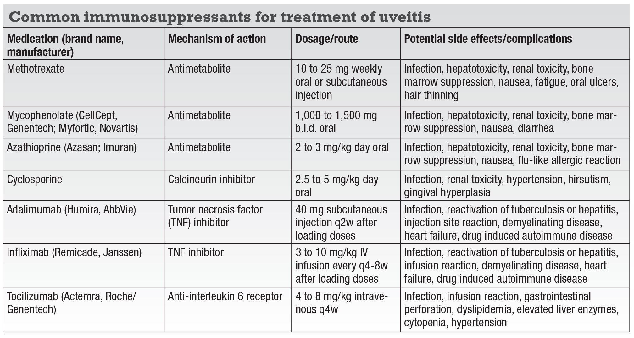 Follow-up data from the Multicenter Uveitis Steroid Treatment (MUST) trial found systemic corticosteroids and immunosuppression yielded better visual acuity at seven years than a long-acting local corticosteroid implant (fluocinolone acetonide 0.59 mg).1 Systemic adverse outcomes were similar between the treatment groups except when more frequent infections required treatment in the immunosuppression arm.1 The goal of steroid-sparing therapy is to control ocular inflammation while allowing for taper of systemic corticosteroids to <7.5 mg daily, with complete taper off systemic corticosteroids being ideal.