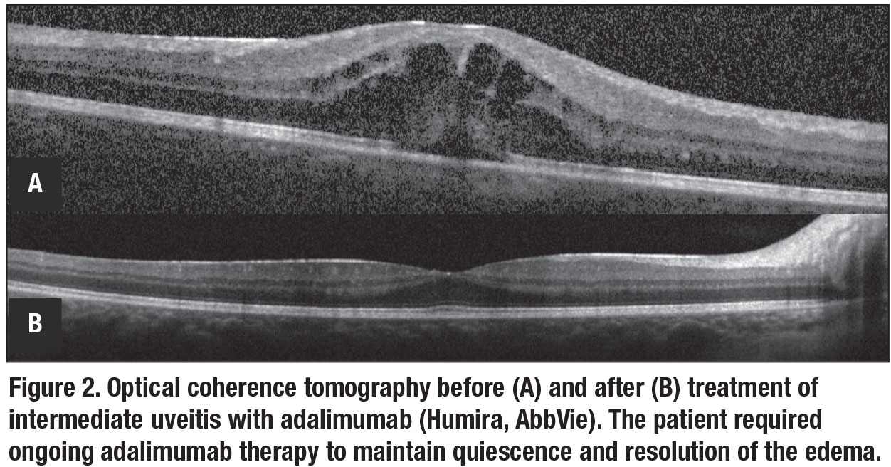 The Food and Drug Administration approved adalimumab, administered subcutaneously, in 2016 for treatment of noninfectious intermediate, posterior and panuveitis. Clinical trials demonstrated adalimumab increased time to treatment failure in both active and corticosteroid-dependent inactive uveitis after systemic corticosteroid taper (Figure 2).7,8 A trial also found adalimumab effective for juvenile idiopathic arthritis uveitis incompletely controlled with methotrexate.9