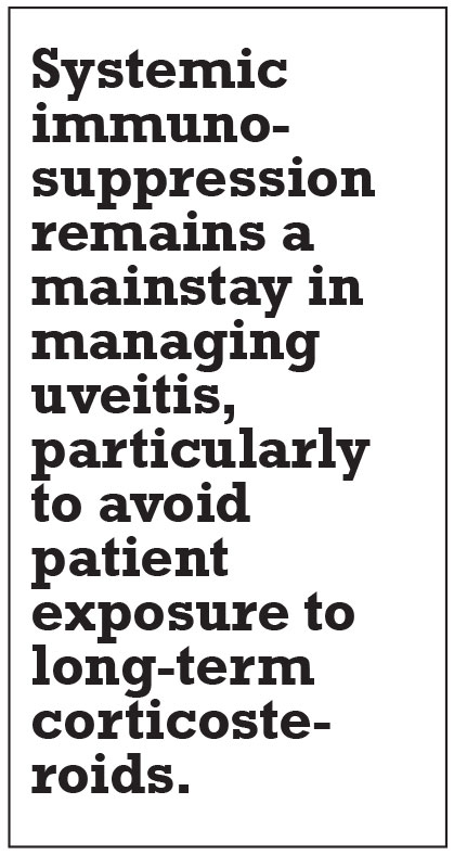 Systemic immunosuppression remains a mainstay in the management of uveitis, particularly to avoid patient exposure to long-term corticosteroids. Many patients will require therapy with more than one agent to control their disease. Collaboration and close communication with rheumatology colleagues are key in selecting an appropriate therapeutic regimen, in determining how patients respond to and tolerate the medications, and in ensuring treatment advances in persistent cases. RS