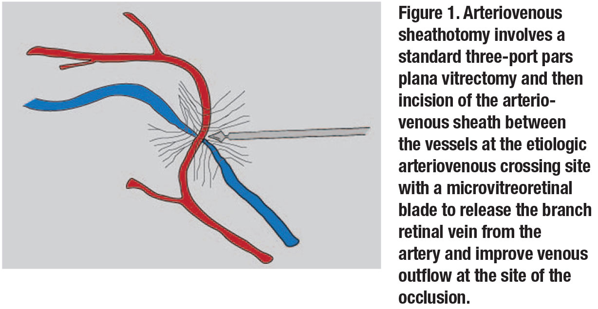 Since venous compression at the site of an arteriovenous crossing may predispose to branch retinal vein occlusion, surgical management has been geared toward this site of pathology. Pars plana vitrectomy with arteriovenous (AV) sheathotomy was first described in 1988 and again in 1999.1,2