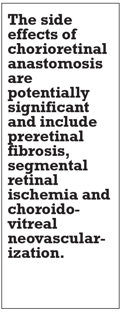 However, the side effects of this technique are potentially significant. They include preretinal fibrosis, segmental retinal ischemia and choroidovitreal neovascularization, so this surgical technique has not been widely adopted. If creation of a chorioretinal anastomosis is sought in select eyes, laser in the clinic is often the method of choice to do so.