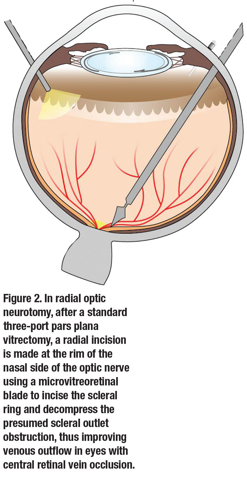 This approach involves performing a standard three-port PPV and then making a radial incision at the rim of the nasal side of the optic nerve to incise the scleral ring and decompress the presumed scleral outlet obstruction, thus improving venous outflow in the central retinal vein (Figure 2, page 30).
