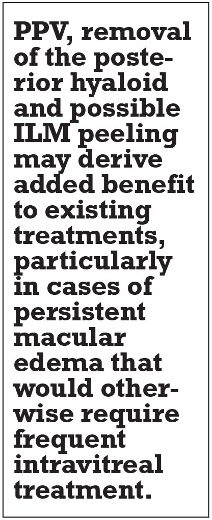 However, PPV, removal of the posterior hyaloid and possible ILM peeling may derive added benefit to existing treatments, particularly in cases of persistent macular edema that would otherwise require frequent intravitreal treatment. The half-life of intravitreal anti-VEGF medications in vitrectomized eyes is shorter than in nonvitrectomized eyes, so they clear faster and have decreased efficacy.25 Thus, longer- acting adjuvant treatment, such as more durable anti-VEGF agents or corticosteroids, may need to be considered after PPV in eyes with RVO.