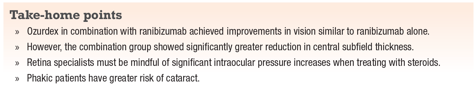 We found that central subfield thickness reduced significantly more in the combination group than in the ranibizumab-only group (110 µm vs. 62 µm, p<0.001). Additionally, about 50 percent of the combination group had a flat retina at week 24 compared with 31 percent of the ranibizumab-only group (p=0.02). The improvement in OCT thickness was rapid and sustained in the combination group. This would be expected because Ozurdex was provided every 12 weeks, not every 24 weeks per the label indication. The investigators believe its duration of action is far shorter than what the label stipulates.