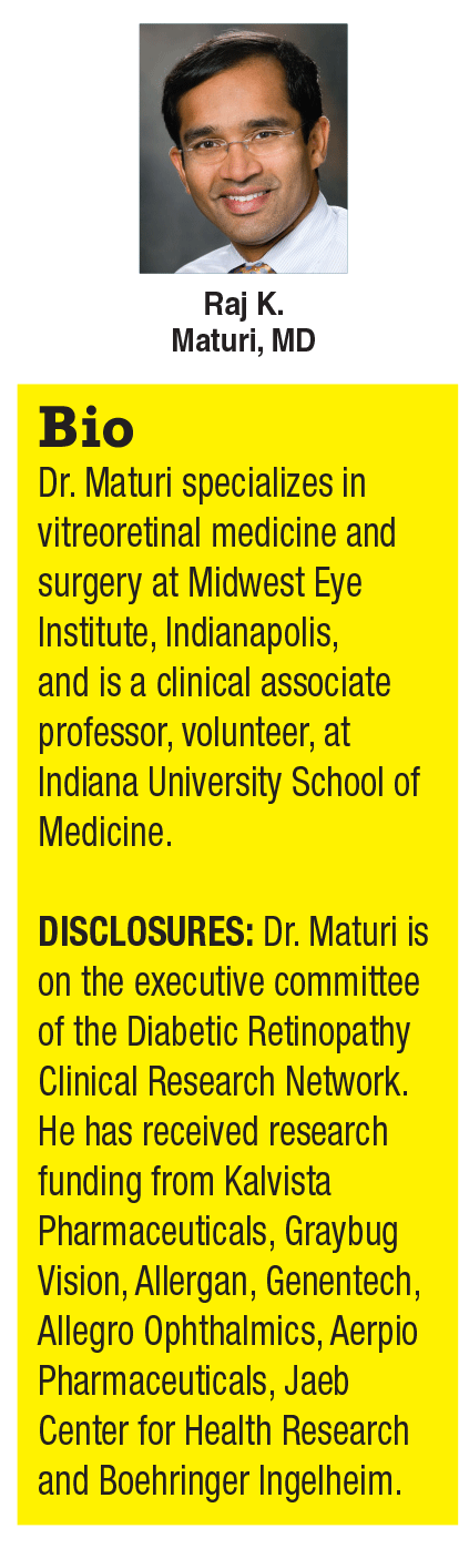 The previous DRCR.net Protocol I study demonstrated that approximately 40 percent of patients treated with ranibizumab continued to have macular edema after six months of treatment.3 Of these, only 32 percent had visual acuity loss with macular edema. Protocol T, which compared aflibercept (Eylea, Regeneron), bevacizumab (Avastin, Roche/Genentech) and ranibizumab, showed that 16, 40 and 27 percent of subjects, respectively, had persistent edema with vision loss of at least 20/32 after six monthly injections.4 These might be the patients most likely to benefit from alternative treatment options, including steroids and laser.