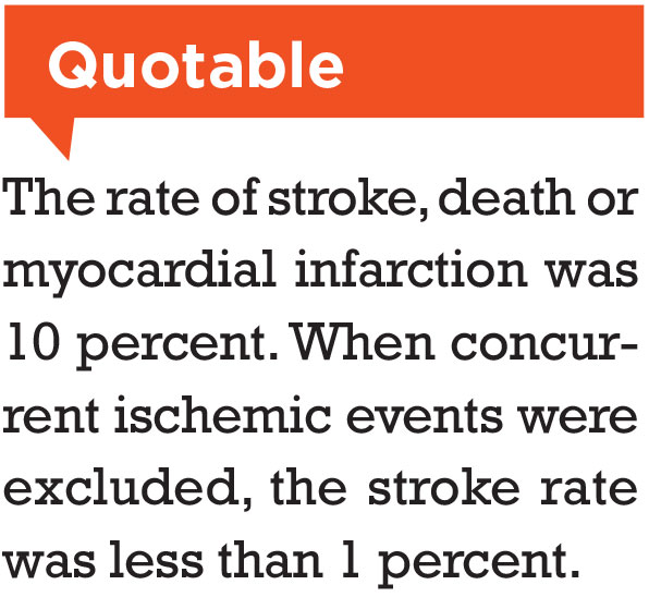 The average age of patients was 66 years. With a median follow-up of 2.2 years, the stroke rate was 2.3 percent (n=5), with four of the strokes occurring at the time of RAO and one at 1.2 years later. Only one stroke patient had greater than 50 percent stenosis of the carotid artery. The rate of stroke, death or myocardial infarction was 10 percent (n=22), Dr. Laczynski says. When concurrent ischemic events were excluded, the stroke rate was less than 1 percent.