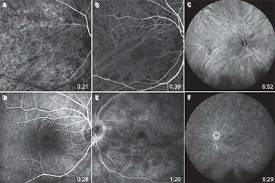 macula; and at 6:29 (F), conveyed a dense hyperfluorescent, peripapillary ring.