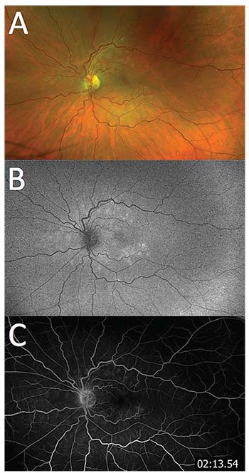 | Figure 1. Color fundus photography (A) demonstrates multiple deep yellow-white lesions of the left eye, which correspond to hyperautofluorescence on fundus autofluorescence (B) and hyperfluorescent wreath-like lesions on fluorescein angiogram (C). |