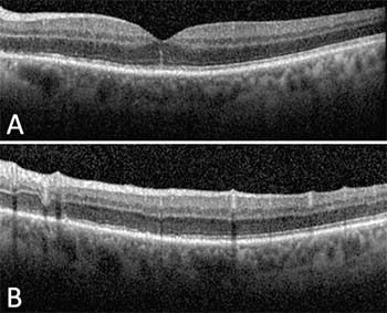 | Figure 2. Spectral-domain optical coherence tomography (SD-OCT) of the left eye through the fovea (A) shows irregularity of the ellipsoid zone and a linear hyperfluorescent line extending into the outer nuclear layer. Through the superior macula (B), SD-OCT demonstrates irregularity and focal disruption of the ellipsoid zone. |