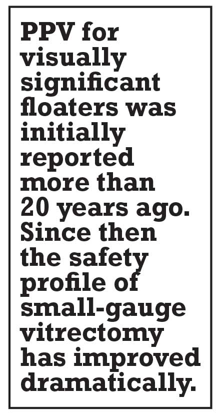 PPV for visually significant floaters was initially reported more than 20 years ago.8 In the past 20 years, however, the safety profile of small-gauge vitrectomy has improved dramatically. Many studies have shown reduced complications with 23- and 25-gauge PPV compared to 20-gauge vitrectomy, including fewer cases of vitreous incarceration at the sclerotomy site, fewer iatrogenic breaks, and less dialysis at the vitreous base.9-14