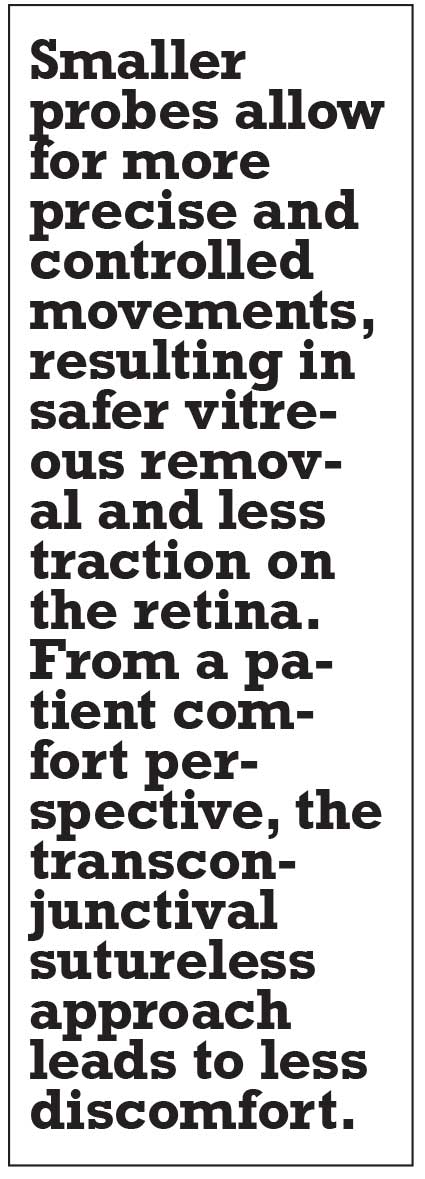 Moreover, smaller probes allow for more precise and controlled surgical movements, resulting in safer removal of the vitreous and less traction on the retina. From a patient comfort perspective, the transconjunctival sutureless approach leads to less discomfort and ocular inflammation.