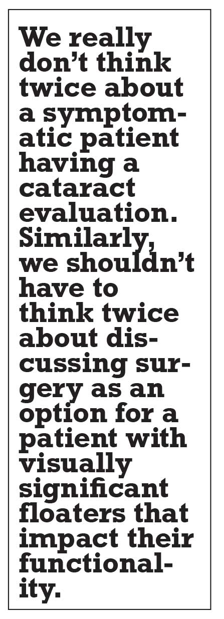 Cataract surgery is routinely performed on patients with objectively “good vision,” because subjectively functional vision loss can affect their quality of life. Patients with VO may similarly have a functional loss of vision with difficulty driving, reading or working. We really don’t think twice about a symptomatic patient undergoing a cataract evaluation. Similarly, we shouldn’t have to think twice about discussing surgery as an option for a patient with visually significant floaters that are impacting their functionality.