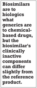 Biosimilars are replicated versions of biologic agents that may be commercialized once the reference agent comes off patent. Biosimilars are to biologics what generics are to chemical-based drugs, but where the active ingredients of generics are the same as their reference brand-name drugs, the clinically inactive components of biosimilars can differ slightly from the reference product.